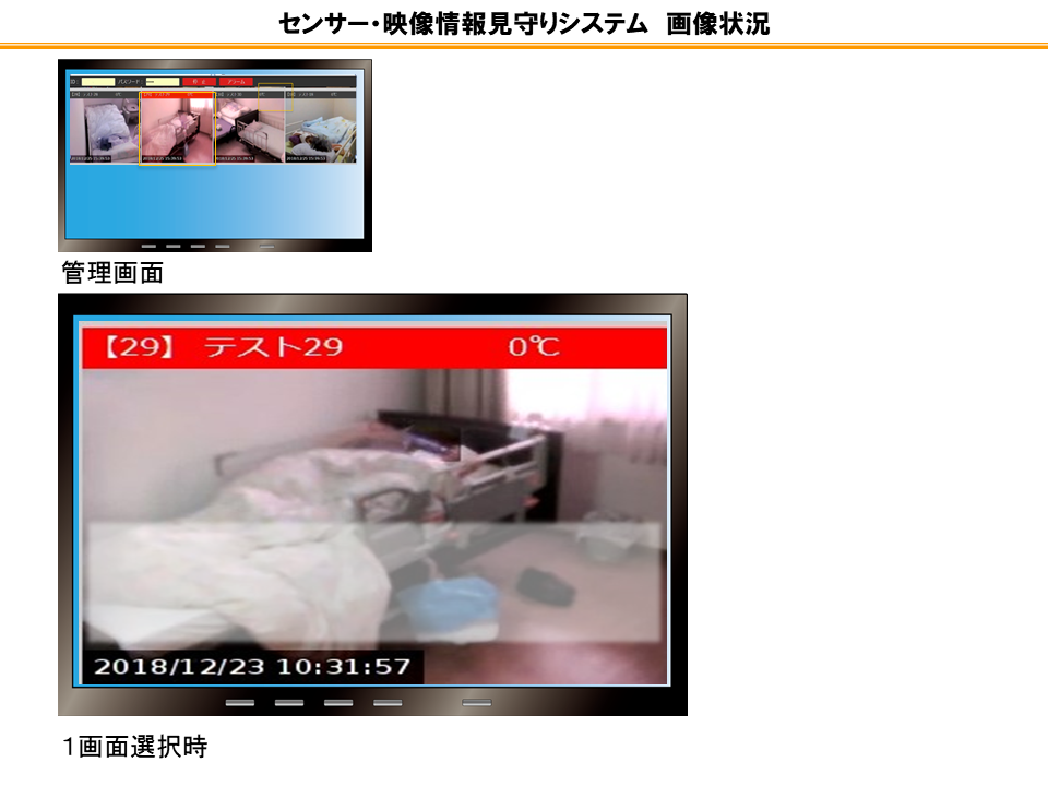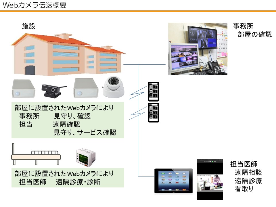 無線LANによりセンサー・映像情報見守り端末を接続し医師や事務所で見守りの補完。